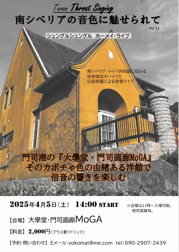 私がホーメイという音楽に出会ってから、はやくも12年目を迎えることとなりました。まだ日本でよく知られていない辺境の地、南シベリアのトゥバ共和国に古くから伝わる、この珍しい音楽に興味を示し、また快く応援いただきました皆様に、心より感謝しています。4月のライブでは、ホーメイ・イギルの名手・鎌田英嗣(かまだえいじ)氏とのユニット、シュングルシュングルとして、トゥバ共和国の民謡と日本の楽曲を組み合わせた独自の音楽世界をお届けします。会場となる、門司画廊MoGAも一見の価値ある場所ですので、是非お越しください。